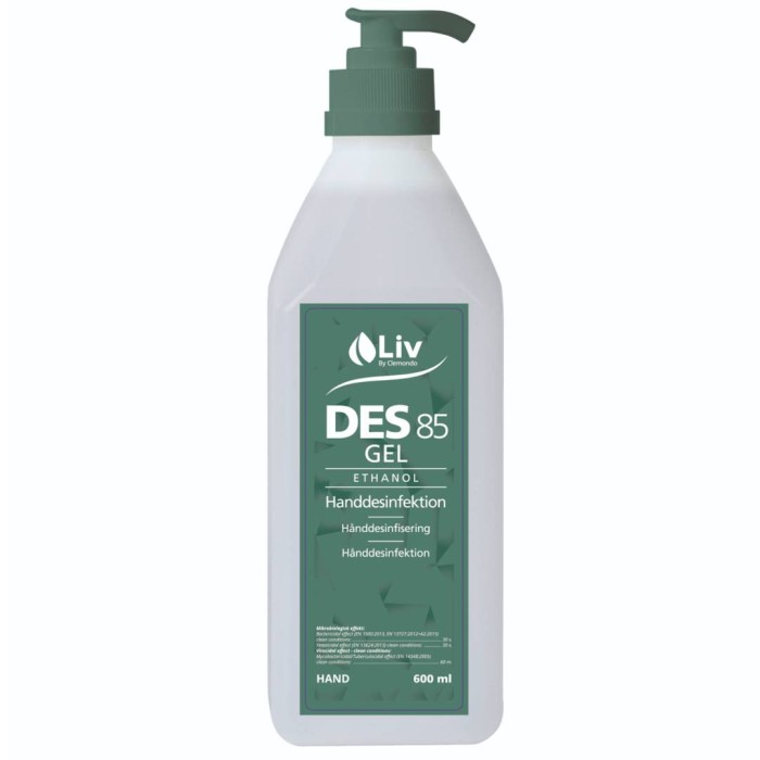 Liv DES 85 GEL är en handdesinfektion i gelform som är återfuktande och lätt att använda för att förebygga och förhindra smittspridning via händerna. Liv DES GEL 85 är effektiv mot olika bakterier, svamp och höljeförsedda virus som t.ex. covid-19 samt murine norovirus (vinterkräksjuka). Liv DES GEL 85 har en alkoholhalt på ca 85 volymprocent. Innehåller glycerin som är en mjukgörare för att förhindra uttorkning av huden. pH-värde 7. Tillverkad i Sverige.