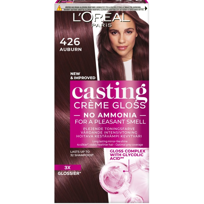 L'Oréal Paris Casting Crème Gloss är en semi-permanent hårfärg för alla hårtyper. Formuleringen är berikad med ett gloss-komplex berikad med glykolsyra**, ger ett resultat med optimal gråhårstäckning, 3x mer glans och 4x mer sammetslent hår*. Om du har långt eller tjockt hår kan två förpackningar behövas.