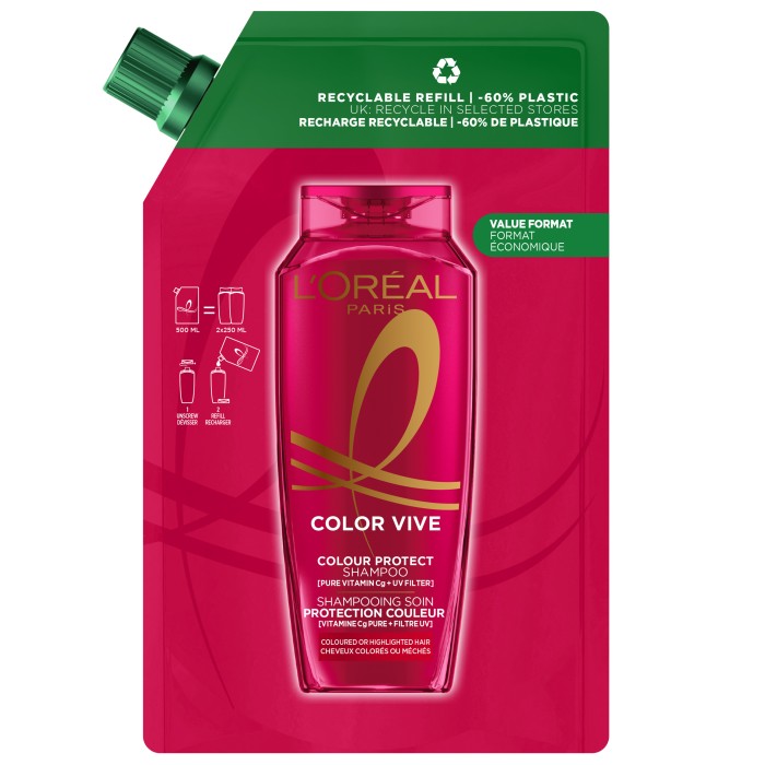Refillförpackning med 500 ml Elvital Color Vive schampo. Använd för att fylla på den flaska du redan har hemma.
