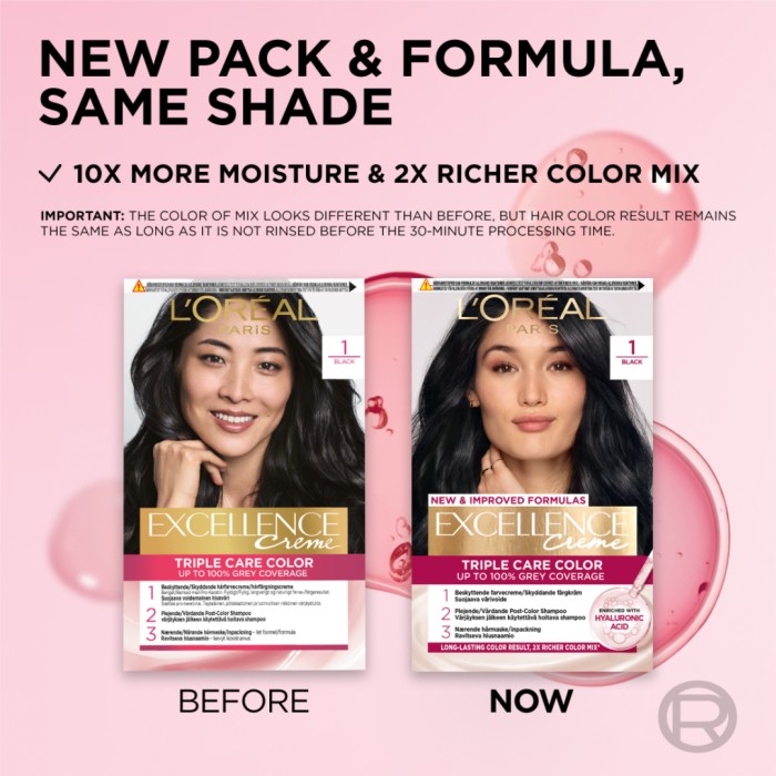 L'Oréal Paris Excellence Crème är en permanent hårfärg för dig som vill täcka gråa hårstrån och samtidigt skydda och stärka ditt hår. I serien Excellence Crème finns klassiska och eleganta hårfärger med ett fylligt färgresultat som sitter i länge. Triple Care Color-rutinen är berikad med hyaluronsyra och verkar i tre steg som stärker och skyddar håret, ger 10X mer fukt** och har en färgblandning som är 2X fastare* så att det inte droppar under färgning. Täcker gråa hårstrån upp till 100% och passar alla hårtyper. OBS! Färgblandningen kan se mörkare ut vid applicering än tidigare formuleringar men slutresultatet är samma så länge verkningstiden på 30 minuter följs.