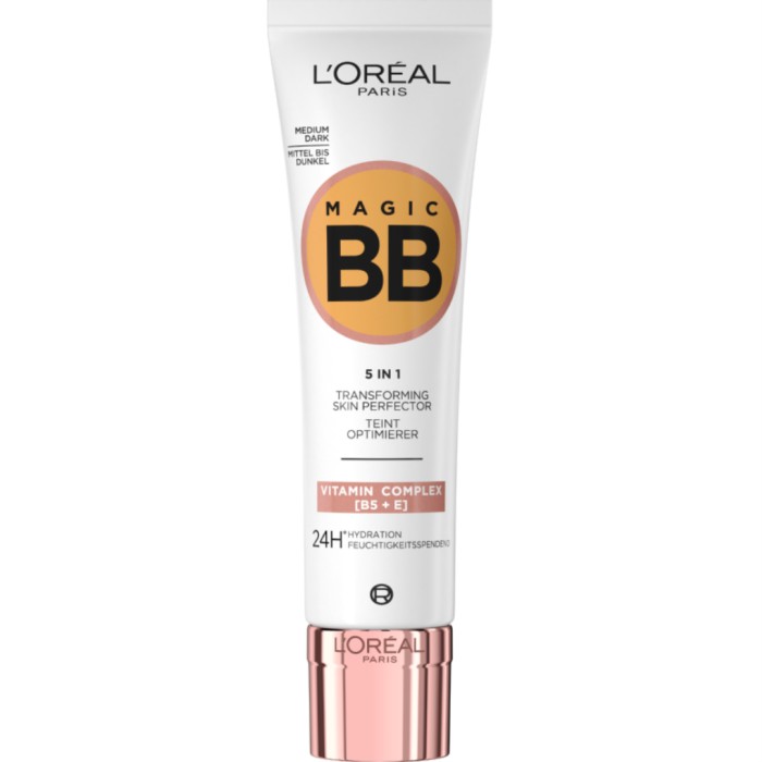 L'Oréal Paris Magic BB Cream är en lätt täckande BB-cream som återfuktar, jämnar ut och ger lyster åt din hud. En lätt täckande BB Cream med SPF 11 som ger din hud fukt i 24 timmar*. Den vårdande formuleringen är berikad med E-vitamin och Pro-Vitamin B5 som förbättrar hudens utseende på 2 veckor**. Inkapslade pigment ändrar färg vid applicering och anpassar sig till din hudton för ett jämn resultat med naturlig lyster. Nyans: 05 Medium Dark.