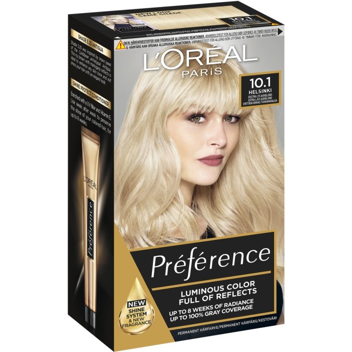 Préférence Helsinki är en permanent hårfärg för dig som gärna färgar ditt hår efter de senaste trenderna. Préférence är framtagen för att ge ett oslagbart färgresultat och en glans som bevaras i upp till 8 veckor. Hårfärgen täcker delvis grått hår (upp till 80 %) och har en formulering med Oil Elixir. Efterbehandlingen Color Lock innehåller UV-filter och E-vitamin. En permanent hårfärg som ger glans och gör att håret känns mjukt.