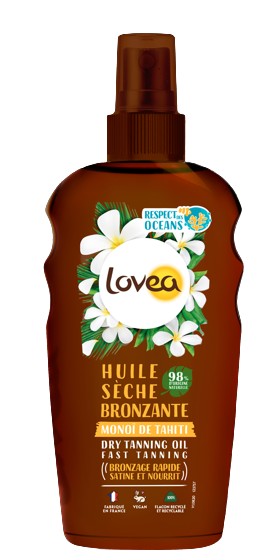 Lovea Dry Tanning Oil med doft av Monoi de Tahiti är en hudolja som inte innehåller SPF. Kan användas för att återfukta huden och förstärka brännan efter en dag i solen. Dry Tanning Oil är baserad på 98% naturliga ingredienser och innehåller Monoiolja som återfuktar huden. Monoioljan är ansvarsfullt framtagen i Tahiti och har ursprungsbeteckning Monoi.
