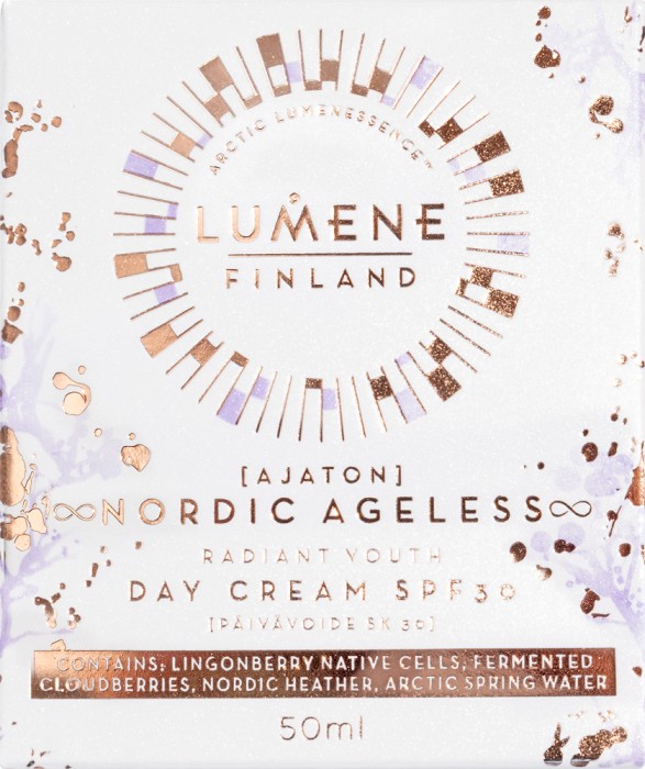Lumene Ajaton Nordic Ageless Radiant Youth Day Cream SPF30 är en fuktgivande och vårdande dagkräm med ingredienser som lingonceller, fermenterade hjortron, nordisk ljung och arktiskt källvatten.