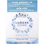 För att minska** miljöpåverkan är denna fuktcreme nu förpackad i en lättare och mer kompakt 50 ml-burk gjord av biobaserad plast. Samma mängd kräm men med 44 % mindre förpackningsmaterial jämfört med den tidigare 50 ml Lumene-burken. Burken ska återvinnas och sorteras bland plast.
