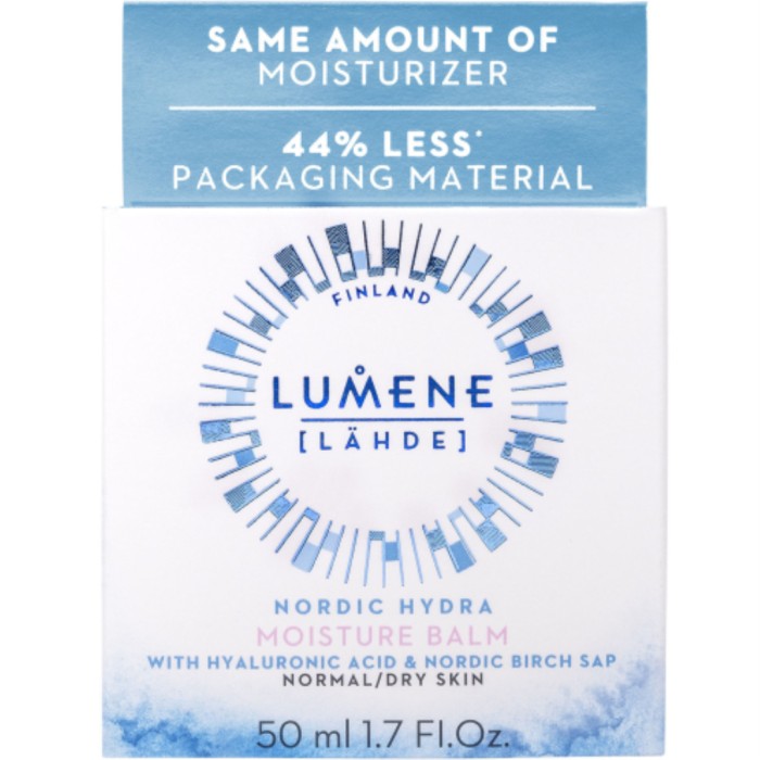 Lumene Nordic Hydra Moisture Balm är en dagkräm för normal och torr hud som ger djup återfuktning och vård omedelbart och i upp till 72 timmar*. Nordic Hydra Moisture Balm har en fyllig konsistens och är berikad med den nya, fylliga trippel hyaluronsyran, återfuktande nordisk ekologisk björksav, rent arktiskt källvatten och nordiskt blåbärsvatten erhållet från biprodukter.