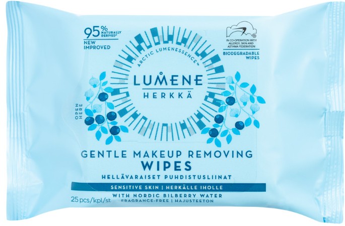Lumene Herkkä Gentle Makeup Removing Wipes är extra skonsamma rengöringsservetter som enkelt tar bort smink från ansikte, ögon och läppar utan att irritera huden. Våtservetterna är berikade med blåbärsvatten och arktiskt källvatten.
