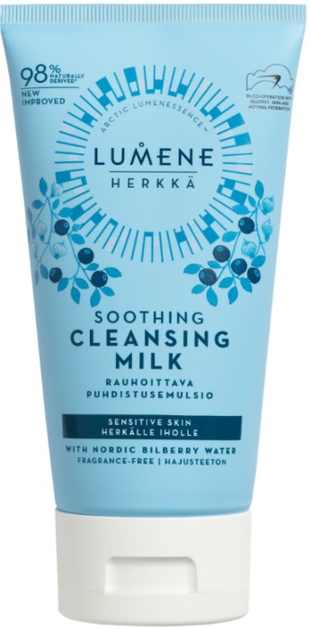 Lumene Herkkä Soothing Cleansing Milk är en lätt rengöringsmjölk berikad med blåbärsvatten och arktiskt källvatten som skonsamt avlägsnar smink och orenheter utan att irritera känslig hy. Herkkä Cleansing Milk har en skön konsistens och lugnar huden och gör så att den känns balanserad och återfuktad.
