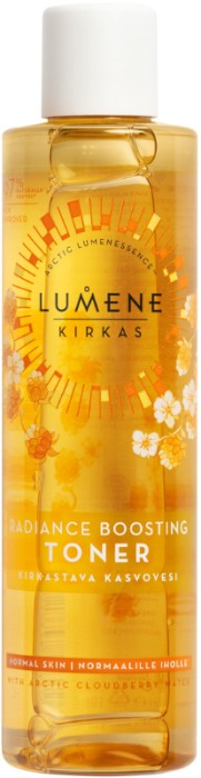 Lumene Kirkas Radiance Boosting Toner är ett lystergivande ansiktsvatten berikat med hjortronvatten och arktiskt källvatten som används som sista steget i rengöringsrutinen. Kirkas Toner hjälper huden att återfå sin naturliga lyster. Rengör och återfuktar huden.