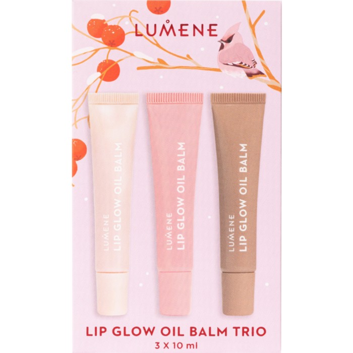 Lumene Lip Glow Oil Balm är en presentask med läppolja i tre fina nyanser. Denna trio hjälper till att hålla dina läppar återfuktade och ger en lätt färg. Lumenes läppolja håller läpparna mjuka, skyddade och fint glänsande hela dagen.