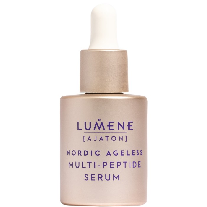 Lumene Nordic Ageless Multi-Peptide Serum är utformat för att förnya huden och rikta in sig på sju tecken på åldrande, dag som natt. Den exklusiva olja-i-serum-formuleringen hjälper till att jämna ut, förstärka, lyfta, ge lyster, återfukta, fylla ut och öka elasticiteten i huden.