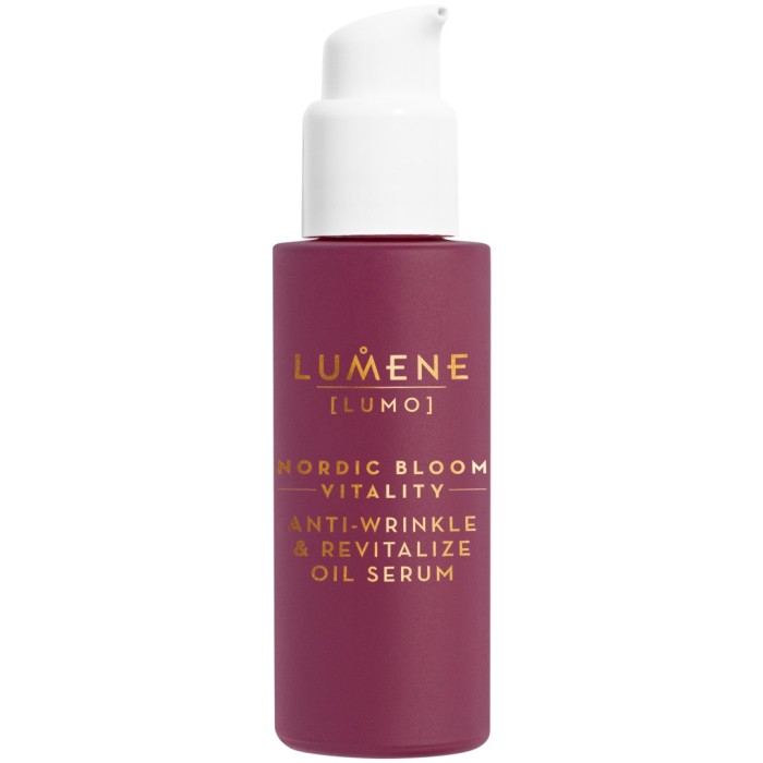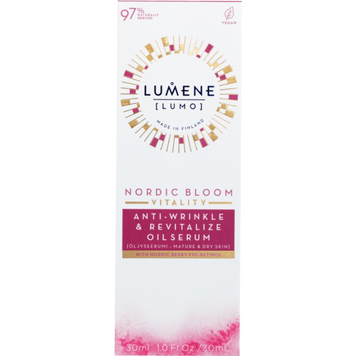 Nordic Bloom Vitality Anti-Wrinkle & Revitalize Oil Serum från finska Lumene är ett ansiktsserum som vitaliserar mogen och torr hud och hjälper till att minska synliga ålderstecken. Nordic Bloom serum bidrar till att minska ålderstecken som rynkor, glåmighet och förlorad volym i huden. Lumenes lyxiga oljeserum innehåller pre-retinol från nordiska bär och nordisk mjölkört som vårdar huden och ger lyster. Vegansk.