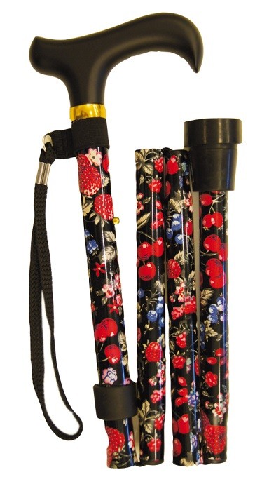 Hopfällbar käpp med smultronmotiv. Käpp är i fyra delar och kan bli mellan 83-92 cm lång. Käppen har ett stabilt derbyhandtag. När käppen är hopfälld är den 30 cm lång.