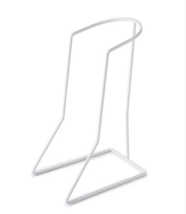 Strumpan träs på ställningen och kan ställas på golvet, därefter förs foten ner i strumpan.