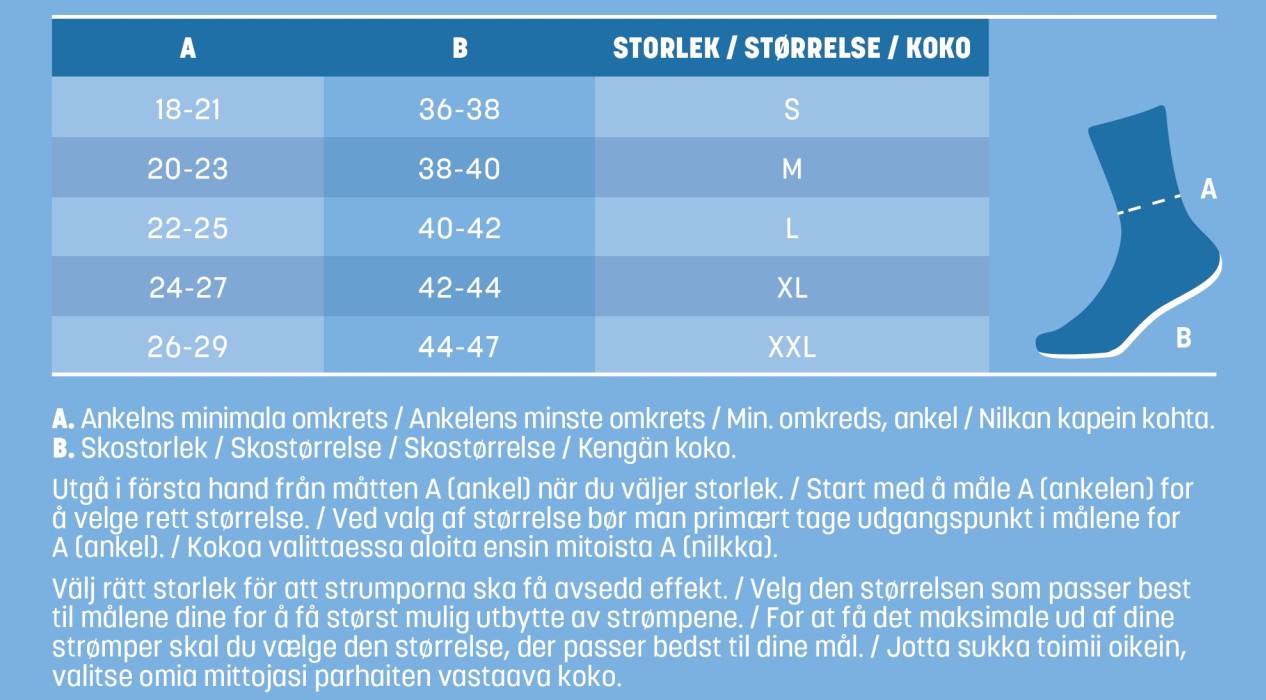 För att hitta din strumpstorlek och för att passformen ska bli perfekt finns det två mått du bör utgå ifrån (i nedan ordning). Se bilden!