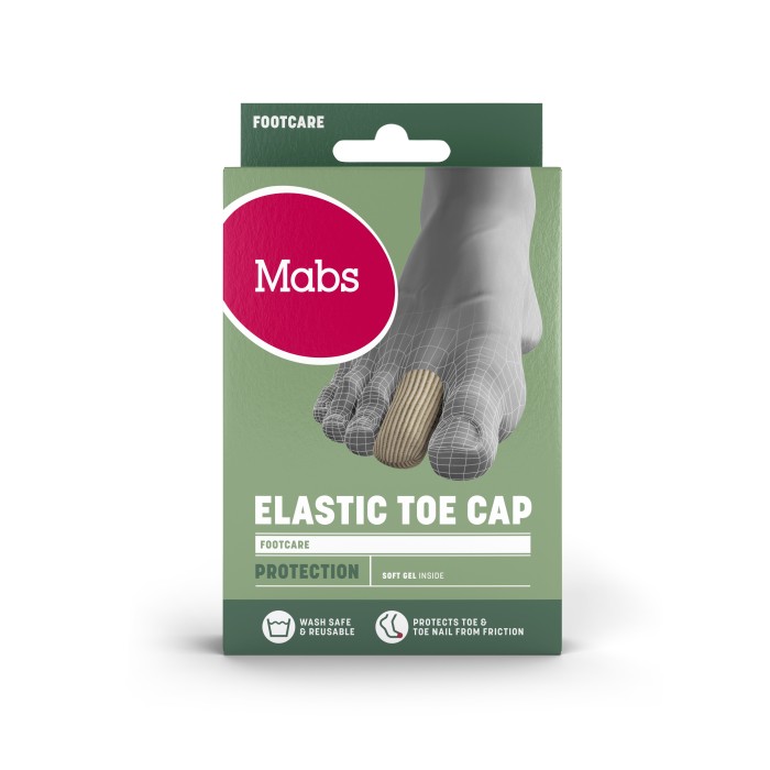 Mabs Elastic Toe Cap är en elastisk tåhätta som är tvättbar. Tåhättan har en insida av gelé som skyddar tån och området kring nageln. Gelen i tåhättan ger skydd mot friktion och är mjuk. Du klipper tåhättan till önskad längd. Kan handtvättas i ljummet vatten och tvållösning. Längd 6,5 cm.