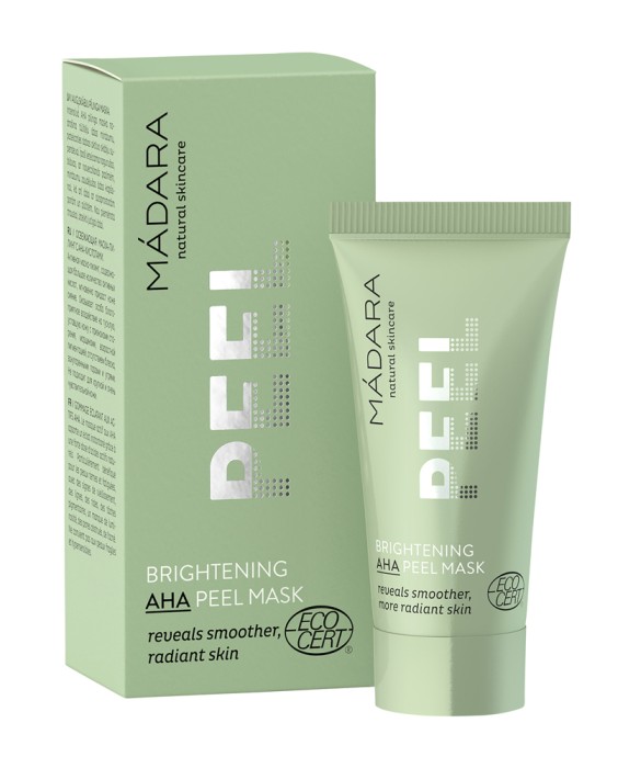 Madara Brightening AHA Peel Mask är en ansiktsmask med aktiva ingredienser. En AHA-peelingmask som ger huden omedelbar lyster.