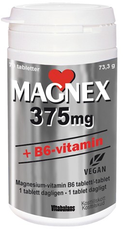 Magnex är ett kosttillskott från Vitabalans med högdoserat magnesium med vitamin B6. Magnesium bidrar till att minska trötthet och utmattning och bidrar till elektrolytbalansen. Magnesium bidrar till normal muskelfunktion och till nervsystemets normala funktion, samt till normal proteinsyntes samt protein- och glykogenomsättning.