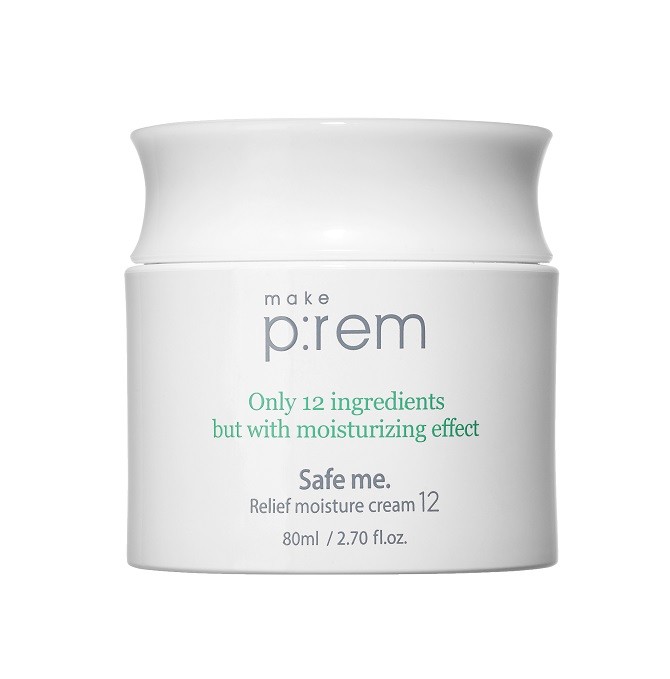Make p:rem Safe Me. Relief Moisture Cream 12 är en lätt fuktkräm för ansiktet som innehåller endast 12 ingredienser. De mycket milda ingredienserna jobbar tillsammans för att lugna, stärka och återfukta torr och känslig hud. Krämen innehåller bland annat squalen som lugnar och skyddar huden, återfuktande glycerin, åkerbär och bergamott , samt salviaolja som lugnar och har en anti-aging-effekt.