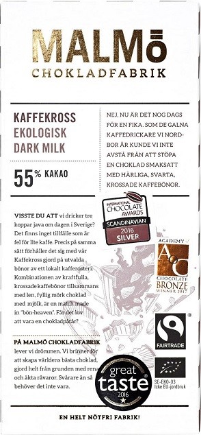 Malmö Chokladfabrik Kaffekross är en ekologisk choklad med 55% kakao smaksatt med krossade kaffebönor.