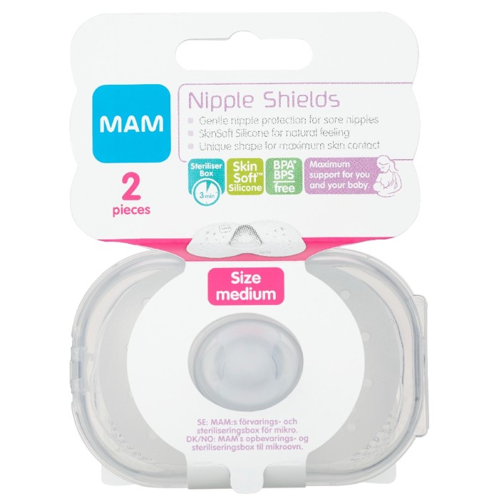 MAM Nipple Shields är amningsnappar som kan underlätta vid amning och motverka eller lindra såriga, ömmande bröstvårtor. Amningsnappen är fjärilsformad och tillverkad i silikon samt ger en känsla som påminner om mammans hud. MAM Nipple Shields är designade för att släppa in luft mellan bebisen och amningsnappen.