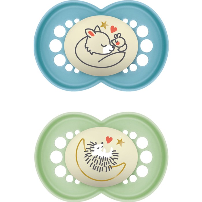 MAM Original Night är en klassisk napp som är skonsam för barnets hud tack vare stora lufthål och en knottrig insida. Sugdelen är gjord i silkeslen silikon (MAM Skin SoftTM) som känns mjuk och välbekant, precis som mammas hud och accepteras av 94% av bebisarna*. Sugdelen på dessa nappar är platt och symmetrisk, och napparna har en självlysande knopp för att vara lättare att hitta i mörker. Dessa nattnappar passar för barn 6-16 månader.