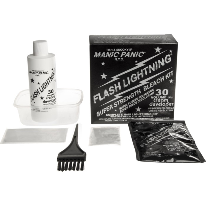 Manic Panic 30 Volume Flash Lightning® Bleach Kit kan användas för att ljusa upp ditt hår innan du använder någon Manic Panic® Semi-Permanent Hair Color, för att få den mest intensiva färgen. Ett Flash Lightning Bleach Kit räcker för kort hår av genomsnittlig tjocklek upp till 4 inches (10 cm) i längd. Om du har längre hår behöver du flera kit - du kan räkna på ungefär ett kit för varje 4-5 inches (10-12,5 cm) hårlängd. Lyfter håret upp till 7 nivåer. Skapat för alla hårtyper och för lockigt hår.