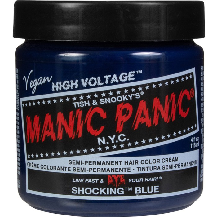 Semipermanent hårfärg från Manic Panic. Shocking Blue är en mörk koboltblå hårfärg. För bästa resultat rekommenderar Manic Panic att ljusa upp håret till en mycket ljus, svaltonad nivå 9 blond eller ljusare. Alla semi-permanenta blå hårfärger kan interagera med gula toner i blekt hår och skapa en grön nyans, så se till att göra ett strängtest innan du applicerar över hela för att säkerställa att du får de resultat du vill ha. Om du vill undvika en möjlig grön underton kan du lägga till en lila nyans som Purple Haze för att balansera detta effekt. När den blandas med Pastelizer blir Shocking Blue en vacker stålgrå pastellnyans!