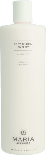 Body Lotion Energy vårdar huden med en kombination av växtoljor, vitaminer och mjölksyra (AHA) och bidrar till hudens fukt- och fettbalans. I sin hudlotion har Maria Åkerberg använt mjölksyra från sockerbetor och sheasmör från vilda träd. Lotionen innehåller eteriska oljor av rosmarin, lavendel, citrongräs och enbär.