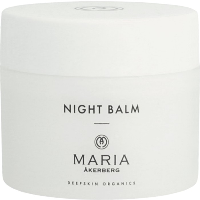 Night Balm är en silkeslen ansiktsbalm för alla hudtyper från Maria Åkerberg. Balmen kapslar in fukt i huden, skyddar den mot yttre påfrestningar och hjälper huden att återuppbyggas under natten. Ansiktskrämen innehåller havtornsolja samt eteriska oljor av olibanum, neroli och citrongräs. Havtornsolja är rik på omättade fettsyror som hjälper huden att bevara fuktbalansen och stärker hudens naturliga barriär. Olibanumoljan är stärkande och utslätande. Nerolioljan stärker hudcellernas uppbyggnad och motverkar rodanad. Citrongräsoljan är fuktbindande och stärkande.