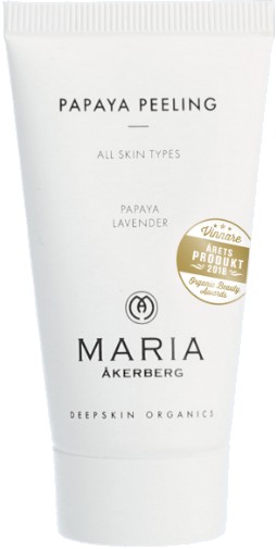 Maria Åkerberg Papaya Peeling är en enzympeeling för ansiktet. Papaya Peeling innehåller papain, ett extrakt av papaya, som varsamt löser upp döda hudceller och förebygger pormaskar, utan att det påverkar underliggande hud.