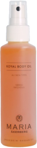 Maria Åkerbergs Royal Body Oil är en lyxig anti-age-kroppsolja med havtorn och eteriska oljor av neroli, patchouli och rosmarin som ger oljan en härlig doft. Oljan är tunn i konsistensen och tas upp av huden relativt snabbt. Royal Body Oil understödjer hudens egen skyddsfunktion och gör huden len. Havtornsoljan är rik på antioxidanter, fettsyror och c-vitamin.