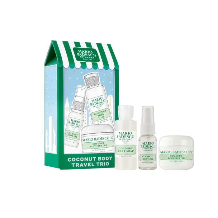 Mario Badescu Coconut Body Travel Trio är ett fint litet kit med Coconut Body Soap (59 ml) för att rengöra huden, Coconut Body Oil (20 ml) för att ge huden lätt fukt och lyster, och det ultrafuktande Coconut Body Butter (56 g) för att låsa in fukt och ge huden en jämnare, mjukare textur med fin lyster.