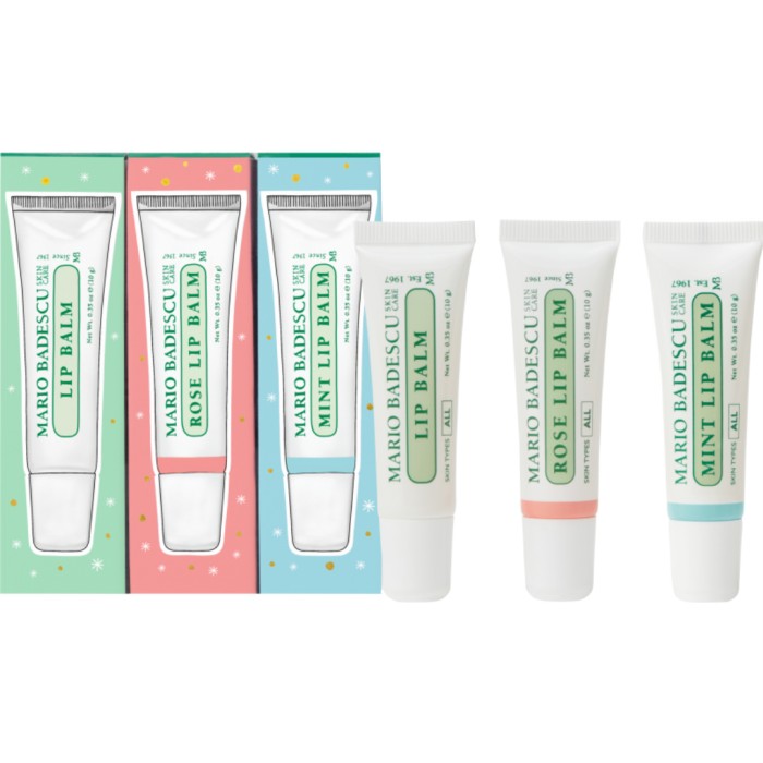 Mario Badescu Lip Balm Trio är ett kit med Mario Badescus tre olika lipbalm á 10 g. Detta färdigförpackade Lip Balm Trio-kit blir kanske en fin gåva! Setet innehåller alla tre av varumärkets bästsäljande läppbalsam: Originalet som doftar lite lätt kokosnöt, ett lipbalm med doft av blommig ros, och ett lipbalm med en doft av uppfriskande mint.
