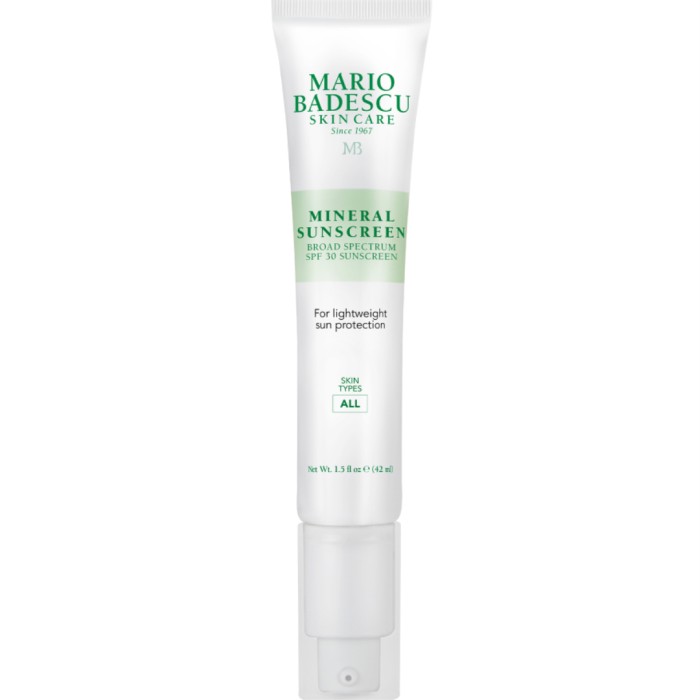 Mineral Sunscreen SPF 30 från Mario Badescu är en fjäderlätt, silkeslen och oljefri mineralsolskyddskräm med SPF 30 för ansiktet. Krämen som ger bredspektrumskydd mot UVA- och UVB-strålar. Den snabbabsorberande, icke-komedogena formuleringen återfuktar huden och ger en len och mjuk finish som du kan applicera din makeup på.