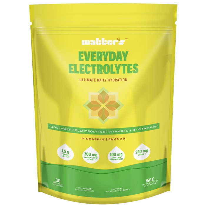 Matter's Everyday Electrolytes är ett pulver som innehåller en balanserad elektrolytmix som hjälper till att upprätthålla vätskebalansen. Everyday Electrolytes innehåller en noggrant utvald blandning av natrium och kalium samt kalcium och magnesium från naturligt havssalt. Kombinerat med kokosvattenextrakt ger pulvret en effektiv återfuktning. Kan drickas under eller efter träning, under varma dagar eller när du vill fylla på med elektrolyter.