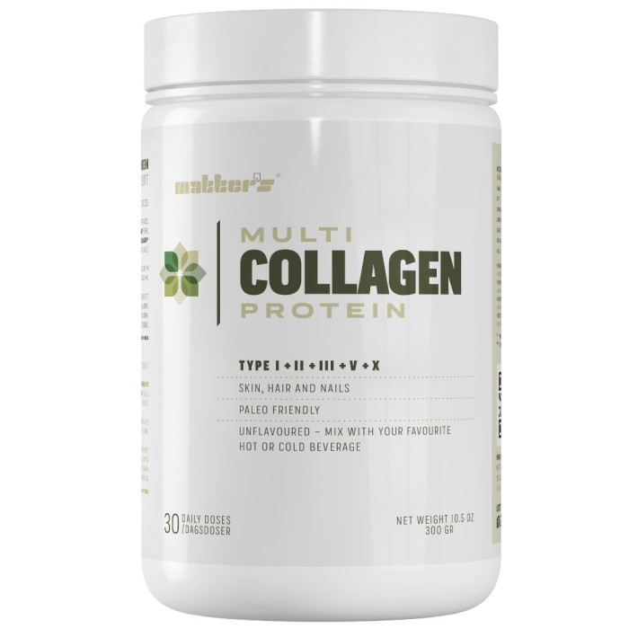 Matter's Multi-Collagen är ett hydrolyserat kollagenpulver baserat på fyra olika källor, med kollagentyperna 1, 2, 3, 5 & 10. Kollagenet är bovint (från gräsbetande kor), marint (från vildfångad fisk), avian sternum (från frigående fågel) och från äggskalsmembran (från frigående höns). Samtliga ingredienser kommer från EU.