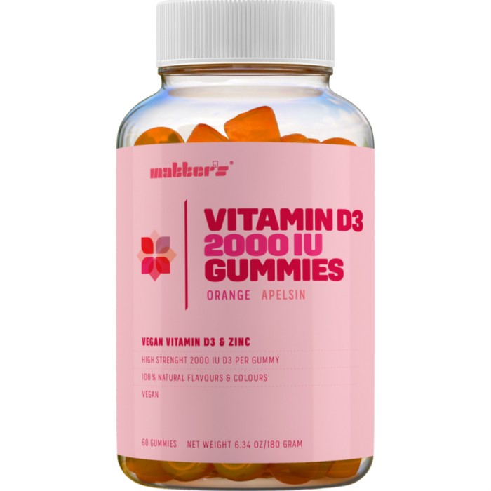 Matters Vitamin D3 2000 IU + Zinc är tuggbara vitaminer som innehåller vegansk vitamin D3 i små gummies med smak av apelsin. Varje vitamingummy innehåller 2000 IU vitamin D3 och är också berikad med 2,5 mg lättabsorberbar zink.