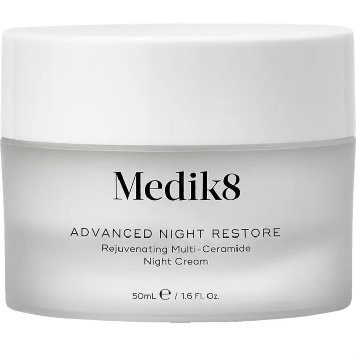 Medik8 Night Restore innehåller Midnight Recovery Complex som ger ett antioxidativt skydd för att bidra till en synbart slätare hud. Ett ceramidkomplex hjälper till att bevara fukt i huden, reglera cellaktiviteten och reparera hudens naturliga skydd. Krämen ger en effektiv återfuktning och innehåller en optimal kombination av ceramid 1 och 3 samt kolesterol och fettsyror som tillför näring till huden. Krämen innehåller skvalan, ett ämne som finns naturligt i hudens skyddande lipidbarriär, för att hjälpa till att återställa hudens försvar och återfukta på djupet. Vegansk formulering.