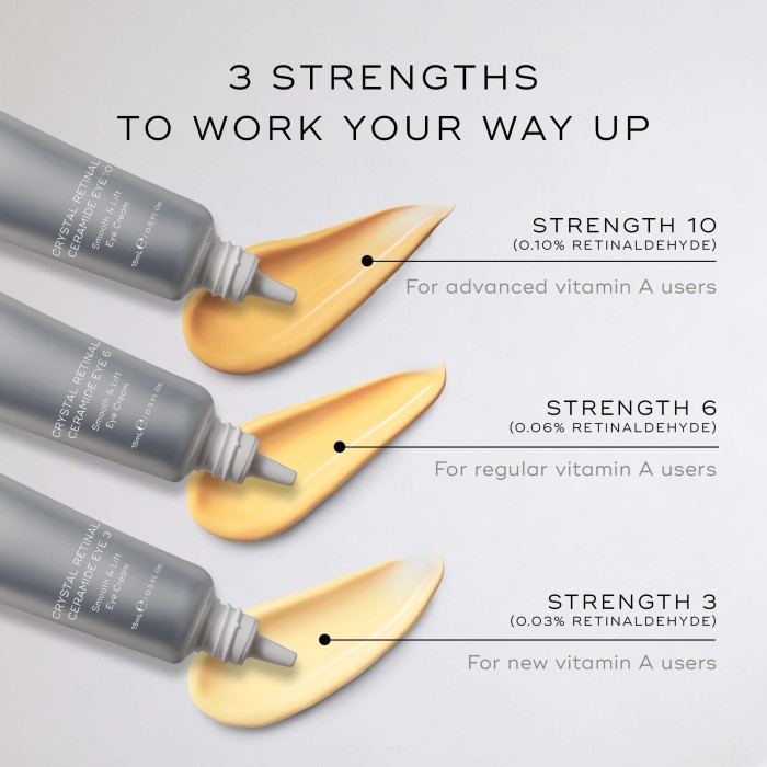Ögonkrämen finns i 3 olika styrkor (0,03-0,1%). Om du aldrig har använt Crystal Retinal-serien tidigare ska du börja med styrka 3, och sen succesivt öka styrka om en mer avancerad produkt önskas. Om du redan använder en Crystal Retinal-produkt kan du matcha styrkan från ditt ansiktsserum med styrkan på ögonkrämen.