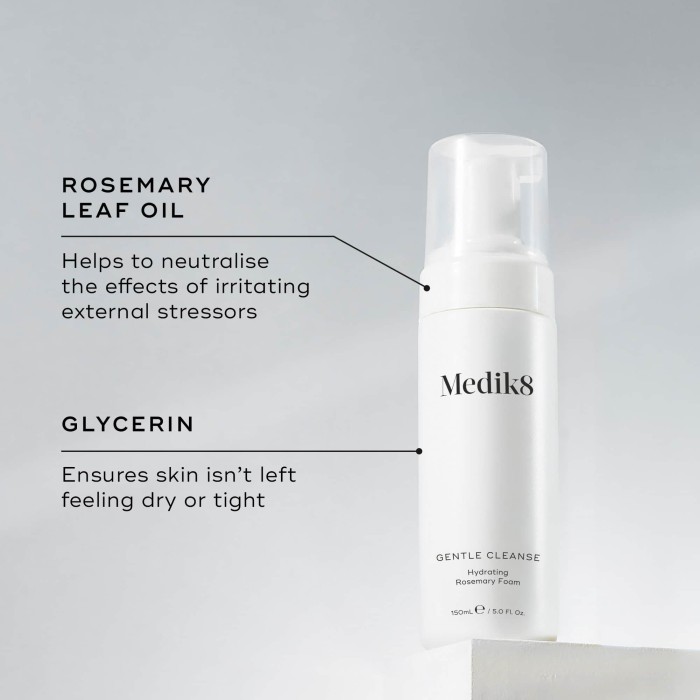 Medik8 Gentle Cleanse Foam innehåller ekologisk rosmarinolja, som är en kraftfull antioxidant som hjälper till att skydda huden från skador orsakade av fria radikaler. Den har också lugnande egenskaper. Glycerin är ett återfuktande ämne som drar till sig vatten från luften och ser till att huden håller sig smidig och återfuktad. Glycerin kan på så sätt reducera grov hud. Extrakt från Yucca Vera lindrar och lugnar huden och motverkar uttorkning. Vegansk formulering.