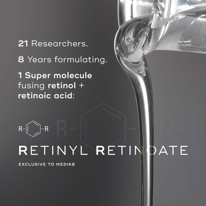 I denna produkt har Medik8 kombinerat två olika A-vitamintyper. Det ena A-vitaminet, Retinyl Retinoate, är upp till 8 gånger effektivare på alla ålderstecken än traditionellt A-vitamin. Trots detta skapar den mycket mindre irritation och sidoeffekter. Det andra A-vitaminet, Retinaldehyde, verkar upp till 11 gånger snabbare på alla ålderstecken än traditionellt A-vitamin. Den har även en bakteriedödande effekt vilket kan ge effekt på problemhud med blemmor. Symbiosen av dessa två A-vitaminer gör detta till en unik produkt som maximerar effekten och resultaten på ålderstecken.