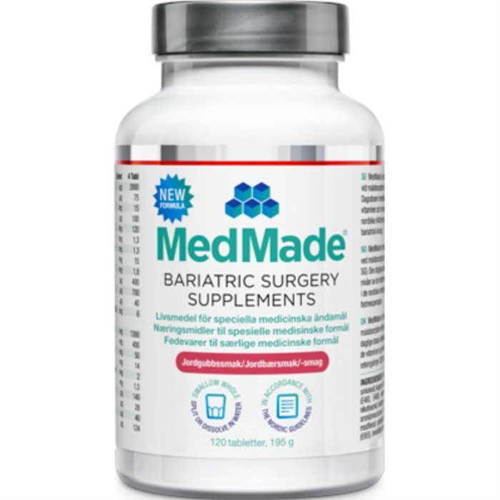 MedMade Bariatric Surgery Supplements är multivitamineral-tabletter med smak av jordgubb för personer som genomgått en viktoperation. Tabletterna innehåller skräddarsydda nivåer av bland annat kalcium, järn, vitamin B12 och vitamin D samt den rekommenderade dosen av ytterligare nödvändiga vitaminer och mineraler. Den rekommenderade dagliga dosen följer de nordiska riktlinjerna för supplementering efter bariatrisk kirurgi.