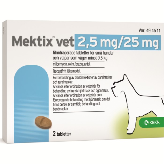 Mektix vet, filmdragerad tablett 2,5 mg/25 mg är ett avmaskningsmedel för små hundar och valpar som väger minst 0,5 kg.