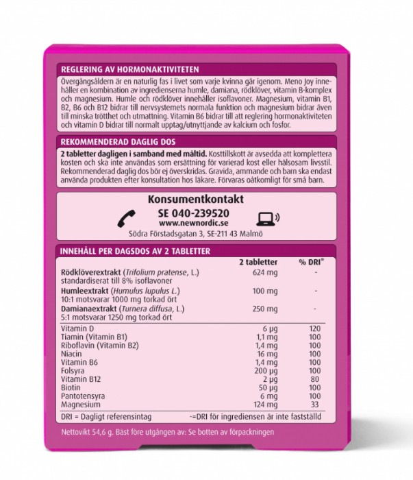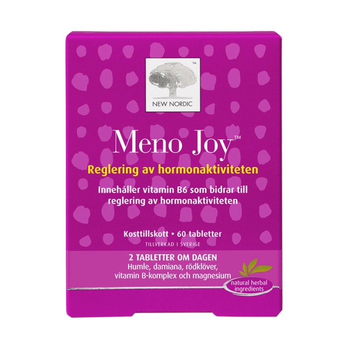 Meno Joy är ett örtbaserat kosttillskott för kvinnor i övergångsåldern. Meno Joy innehåller en kombination av ingredienser som humle, damiana och rödklöver samt vitamin B-komplex och magnesium. Vitamin B6 bidrar till reglering av hormonaktiviteten.