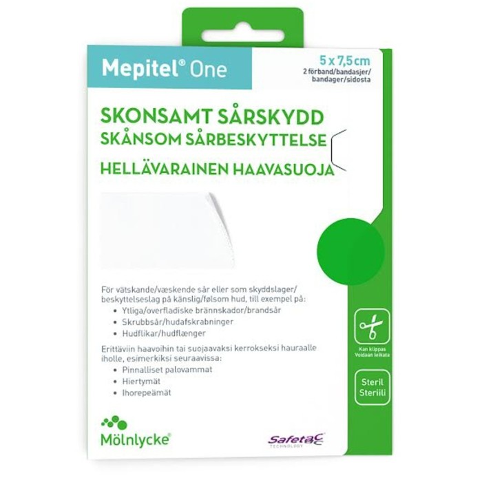Mepitel One kan användas för ett stort antal olika sår såsom skrubbsår och brännskador. Minskar smärta och vävnadsskada i samband med förbandsbyte.