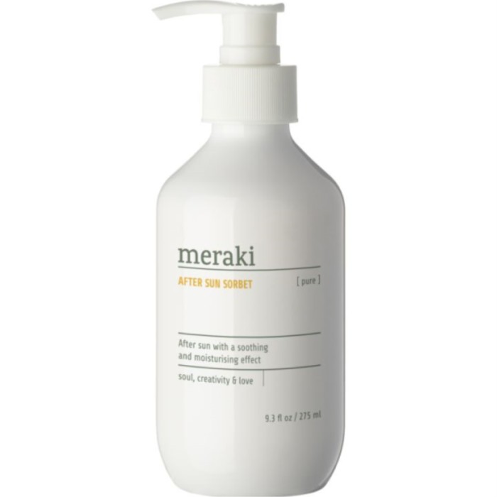 Meraki After Sun Sorbet Pure är en skön lotion att använda efter en dag i solen. Innehåller lugnande aloe vera och mandelolja och E-vitamin som mjukar upp och bibehåller hudens elasticitet. After Sun Sorbet innehåller pentavitin som har en förmåga att ge intensiv fukt, vilket gör huden mjuk och slät. Absorberas snabbt och gör att huden känns slät och återfuktad. Kan användas av hela familjen. Vegansk.
