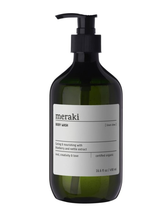 Body Wash Linen Dew från Meraki är en uppfriskande duschtvål som ger huden näring och fukt. Linen Dew duschgel innehåller ekologiska extrakt från blåbär och brännässlor, som innehåller mineralsalter. En återfuktande aktiv ingrediens från sockerbetor hjälper till att stärka hudens naturliga barriär.