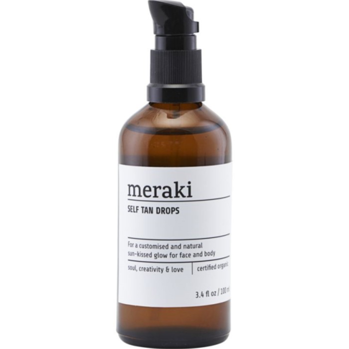 Meraki Brun-utan-sol droppar blandas med en hudkräm eller lotion och ger huden en sommarlyster - utan att du behöver vistas i solen. Dessa parfymfria brun utan sol-droppar från Meraki är formulerade med ekologisk aloe vera som återfuktar huden. Ekologiskt havreextrakt och ekologiskt gurkextrakt har tillsatts för sina vårdande, lugnande och återfuktande egenskaper. Den aktiva ingrediensen som skapar lyster är DHA, ett naturligt socker. DHA reagerar med hudens yttre lager och gör huden mörkare. När de döda hudcellerna försvinner kommer lystern att trappas ned.