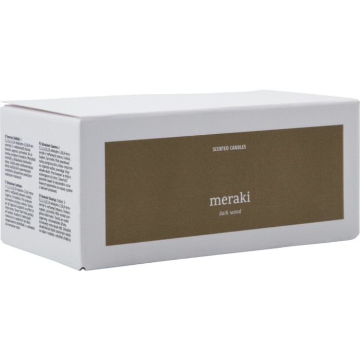 Merakis doftljus Dark Wood skapar en varm atmosfär hemma. Doftljuset har en rik träig doft med toppnoter av rom, svartpeppar och ros som blandar sig vackert med hjärtnoter av muskot, kryddnejlika och bärnsten, medan basnoter av sandelträ, cederträ och patchouli ger en jordnära avslutning. Ljuset har en veke av bomull och är tillverkat i EU.